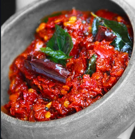 Pandumirapakaya pickle has a thick, slightly coarse texture and a bold combination of spicy, tangy, and salty flavors. It is commonly served as a side dish with hot steamed rice, ghee, dosa, idli, or chapati, adding a powerful spicy kick to the meal.